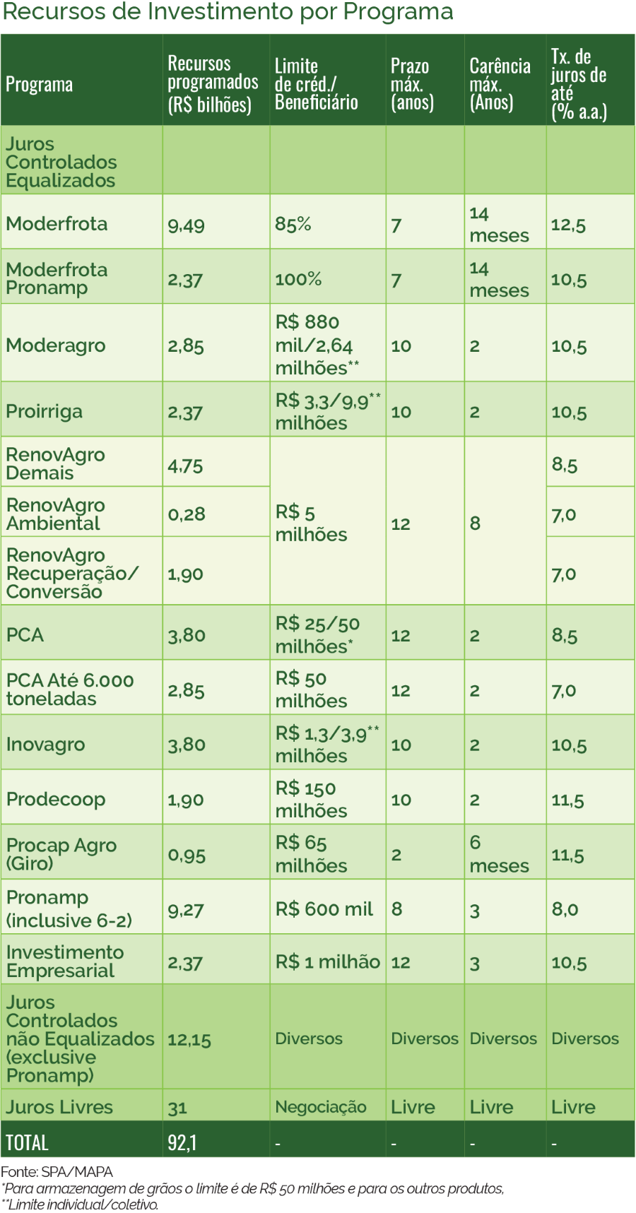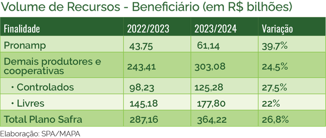 Os recursos são destinados para o crédito rural para produtores enquadrados no Programa Nacional de Apoio ao Médio Produtor Rural (Pronamp) e demais. O valor reflete um aumento de cerca de 27% em relação ao financiamento anterior (R$ 287,16 bilhões para Pronamp e demais produtores).