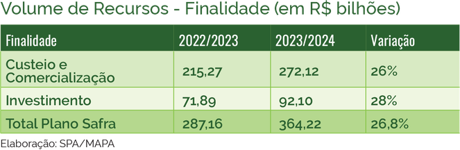 Plano Safra 2023/2024: recurso total de R$ 364,22 bilhões.